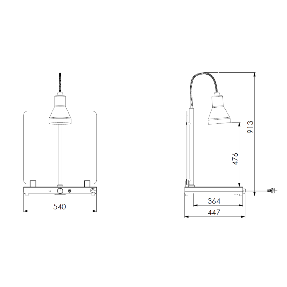 - AISI 304 nerūsējošā tērauda griešanas stacija GN 1/1 izmērā ar vienu sarkanu infrasarkano lampu, kas piestiprināta pie elastīgas caurules ar klasiska dizaina abažūru.